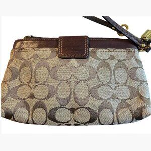 Coach Signature Brown Jaquard Canvas Leather Trim Turn Lock Vintage Wristlet EUC