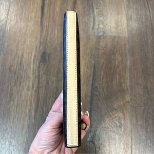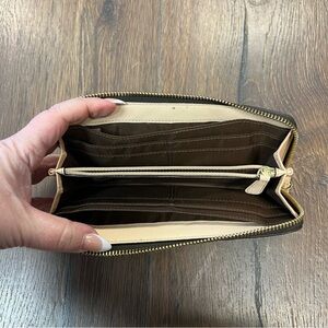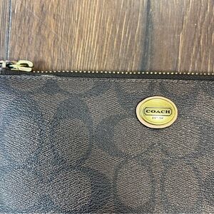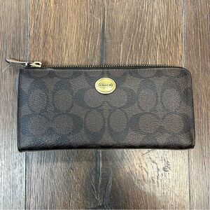 Stylish Coach wallet in brown. Features a zip closure and signature logo.