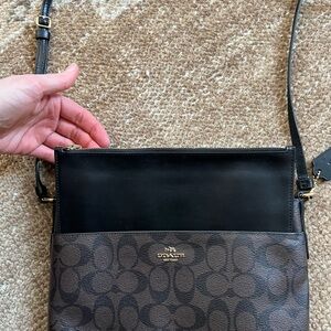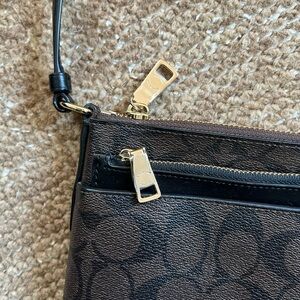 Elegant brown shoulder bag with Coach logo. Features adjustable strap and front pocket. Comes with black insertable pouch. Plastic covering still on the zippers. Never worn.