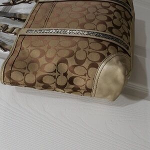 Coach Signature Brown Tan Canvas Tote Bag – Gold Leather Trim Handles G05J-8K52