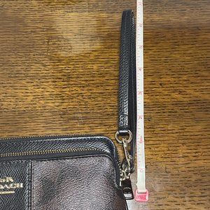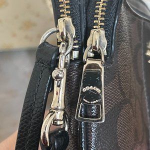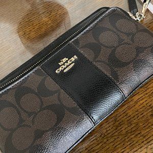 Coach Signature Brown Wristlet. Has a front zipped pocket. The second top zipped pocket has plenty of space for credit card storage - holds up to 8 credit cards. Does not come with dust bag.