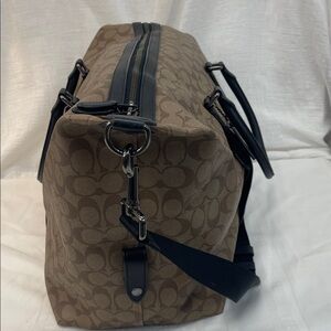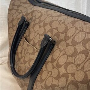 Elegant Coach duffel bag with signature pattern. Features brown canvas and black leather accents. Ideal for travel or daily use.