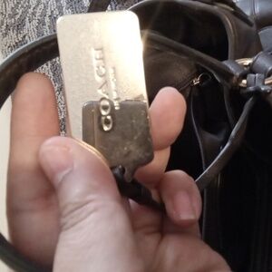 Elegant Coach shoulder bag with signature pattern. Brown and black design. Ideal for everyday use. this one I bought at the actual coach purse 21 years ago. I used it twice n as you can see never used the strap...has tiny marks nothing major... a little dusty on the outside tho n