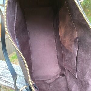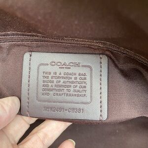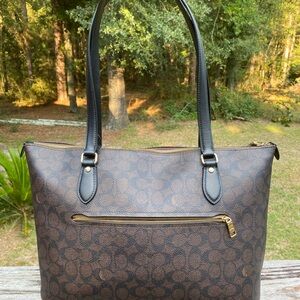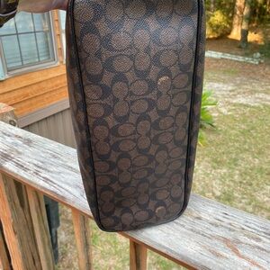 Stylish Coach tote with signature pattern. Features dual black handles. Ideal for everyday use.