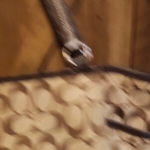 Stylish Coach shoulder bag with signature pattern. Brown leather accents. Perfect for everyday use.