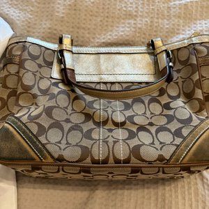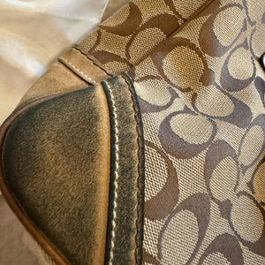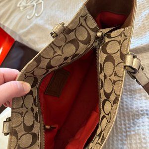Tan colored coach purse with brown signature Coach c pattern, suede pads, leather handles, red interior, used (discoloration from jeans shown), dust bag included
