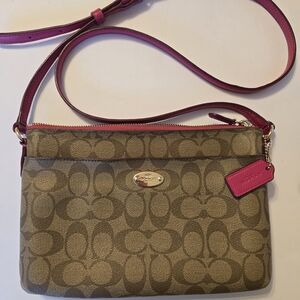 Elegant Coach crossbody with iconic brown design. Comes with a bold pink pouch. Ideal for daily use. In good condition . Approximately 10.5 inches wide. Minor dirt spots inside pocket. #236