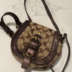 Y2K Coach crossbody with signature pattern. Ideal for daily wear. Features adjustable strap purple satin lining. Please view all photos as there is a spot on the backside of the purse. Slight signs of wear. But in really nice condition for its age!