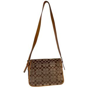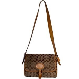 Classic and versatile, this Coach Signature Flap Messenger Bag (Style No. K1J-6081) blends the iconic “C” jacquard canvas with genuine tan leather trim. Designed for everyday wear, it’s both structured and roomy — perfect for errands, travel, or a polished vintage streetwear look.