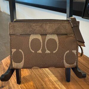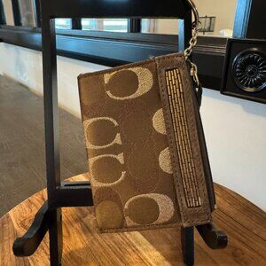 Coach ID case, Coach mini wallet, Coach skinny ID case, Signature C, brown wallet, gold beaded trim, slim wallet, card holder, key ring wallet, travel wallet, small Coach wallet, compact wallet, lightweight wallet, authentic Coach, preloved Coach, designer wallet, Coach accessories, beaded wallet, mini pouch, Coach canvas wallet