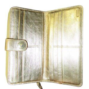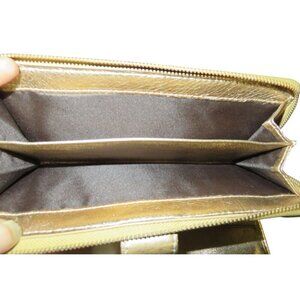 This Coach long wallet features a signature C canvas with leather accents and a touch of glitter. With a zip-around and snap closure, it ensures security and style for your essentials.