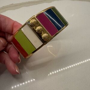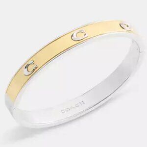 Stylish gold hinged bangle bracelet with a cream heart charm. Perfect for any occasion.