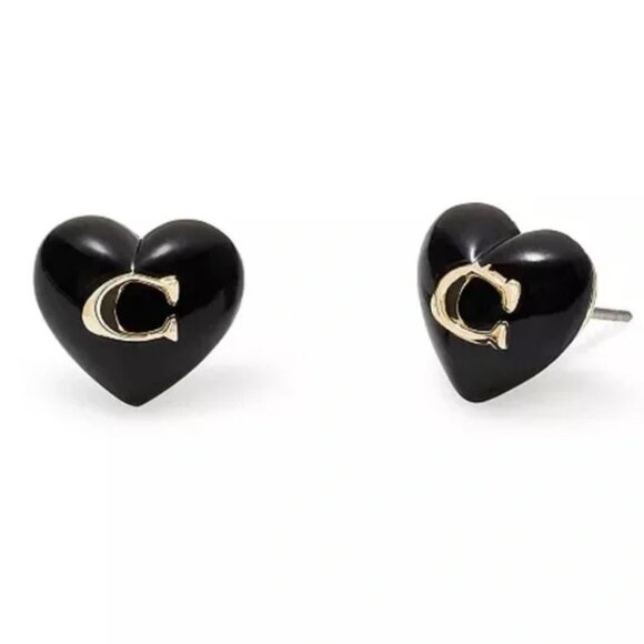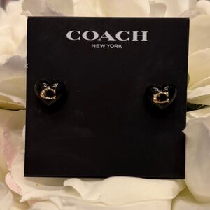 New with Original Packaging - Coach Signature C heart shaped iconic stud earrings. Black with gold detailing resin and gold-tone plated.