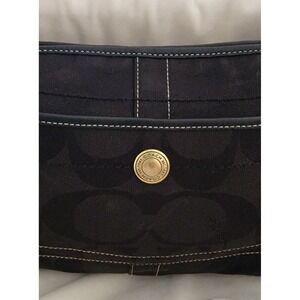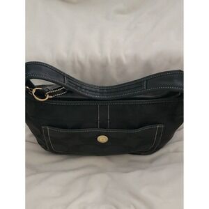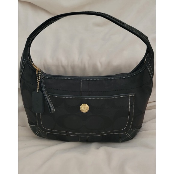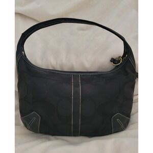 Keywords: hobo bag, shoulder bag, monogram, designer handbag, black purse, leather accent, street style, chic, casual luxury, everyday carry, classic, authentic coach