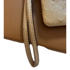 The Coach Signature C Logo Beige Nude Embossed Patent Leather Corner Zip Wristlet is a chic and practical accessory for everyday use. Crafted from luxurious patent leather with the iconic embossed Coach logo, this wristlet features a secure corner zip closure and a neutral beige-nude tone that complements any outfit. Compact yet functional, it’s perfect for carrying essentials like cards, keys, and small personal items on the go. A timeless piece that blends elegance, durability, and signature Coach style.