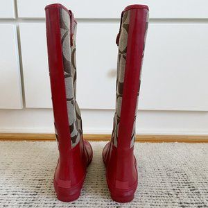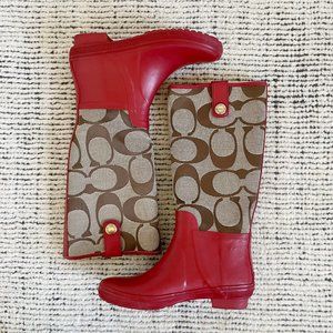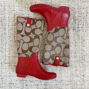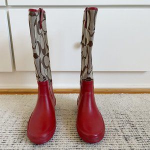 Top part of boot has the canvas CC logo, bottom half of boot is red rubber for rain protection, pull on design, signature jacquard detail, red leather tabs with gold coach hardware.