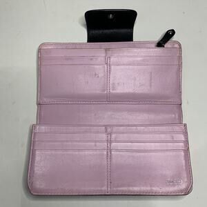 COACH Signature C Snap Close Long Black Ivory Wallet with Lilac Interior is in very good condition. Inside has some discoloration of zippered coin pouch and some overall light wear.