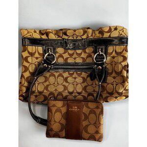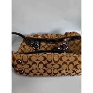 Coach Signature C Tote Bag Khaki Brown Black Leather Trim With Wristlet F14686