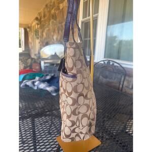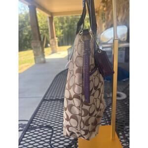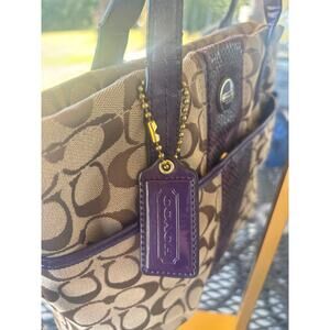 The interior is lined with a smooth purple fabric and includes multiple slip and zippered pockets for organization. The bag shows signs of use, including some wear on the handles, and hardware, consistent with a well-loved item. The leather Coach hangtag has a beautiful deep purple color with a subtle shimmer. This is a perfect everyday tote that adds a pop of color and texture to your look.