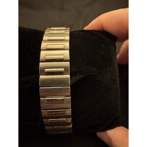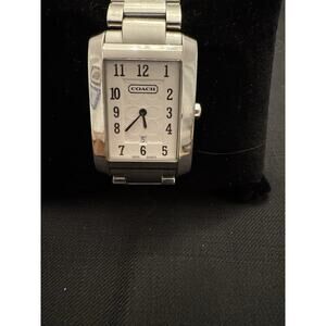 The Coach Signature C rectangular quartz watch with a stainless steel bracelet is a stylish and elegant timepiece designed for women. Featuring a silver dial with the signature logo pattern, this casual watch has a polished silver stainless steel case and bracelet. With a water resistance of 30m, this quartz movement watch is perfect for everyday wear. This watch is a timeless accessory that adds a touch of sophistication to any outfit. This watch has a new battery.