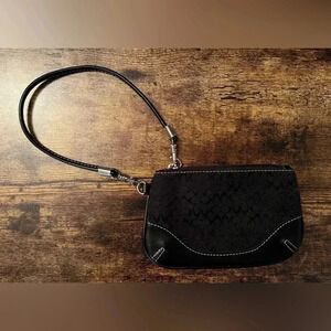 Coach | Signature C wristlet. Black Coach logo “C” canvas with leather bottom and white stitching. This black leather strap. Silver metal hardware. Black sateen interior, Coach fabric. Zippered top closure. Size: 4”x6”. Like new condition. Beautiful little classic Coach wristlet