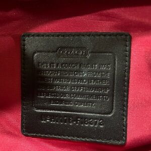 Embossed black leather with Coach branding. Set on rich pink fabric.
