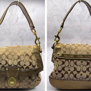 Chic and classic Coach purse featuring the iconic Coach Signature โCโ canvas in neutral tones, complemented with luxurious metallic gold leather trim and strap.