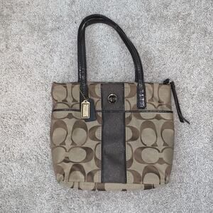 Coach Signature Jacquard Slim Shoulder Stipe Tote Bag Tan and Brown