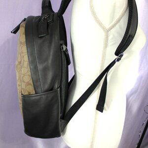 This Coach signature backpack features the classic brown monogram canvas paired with smooth black leather trim for a modern, durable finish. It includes a spacious main compartment, interior zip pocket, slip pockets, and a front vertical zip pocket for easy access. Designed with comfortable padded shoulder straps and a top handle, this backpack works perfectly for everyday use, work, school, or travel. Clean interior, strong structure, and excellent overall condition with no major signs of wear.