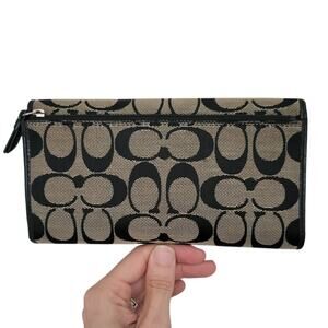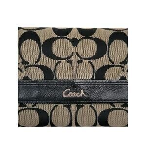 Coach Signature Canvas & Leather Pleated Trifold Card Wallet Snap Clutch Brown