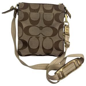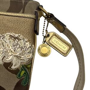 Coach Signature Canvas Monogram Embroidered Floral Sling Crossbody Bag Tan Gold