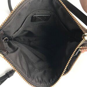 • Exterior: brown leather trim, front slip pocket, pinmount, hangtag