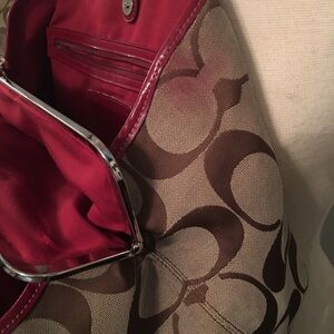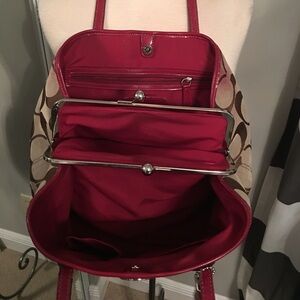 Keywords: Coach bag, Signature canvas, Satchel handbag, Beige and brown, Red purse, Designer handbag, Coach purse, Tote bag, Shoulder bag, Everyday bag, Stylish handbag, Luxury bag, Coach signature