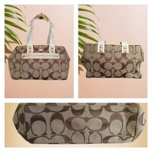Classic Coach Signature Tote Satchel in brown and beige canvas. This stylish and roomy handbag offers a timeless design perfect for everyday use. It is in good pre-owned condition with some minor stains on both the interior lining and exterior fabric from previous use. No holes or tears in the canvas. A sturdy, durable, and recognizable Coach piece with plenty of life left.