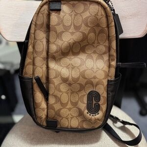 Authentic -This Coach Signature Canvas Sling Pack combines luxury and function in one sleek design. Crafted from tan coated canvas with the iconic “C” pattern and black leather trim, this crossbody bag is perfect for on-the-go style. Features an adjustable strap, front zip pocket, and spacious main compartment ideal for everyday essentials or travel.