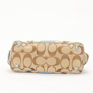 Elevate your everyday look with this authentic Coach tote. Featuring the iconic "C" logo canvas in neutral beige with contrasting light blue leather accents, this bag blends style and practicality.