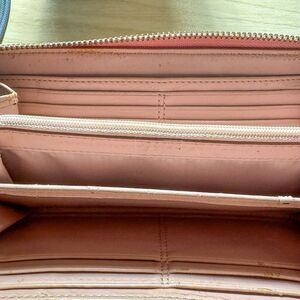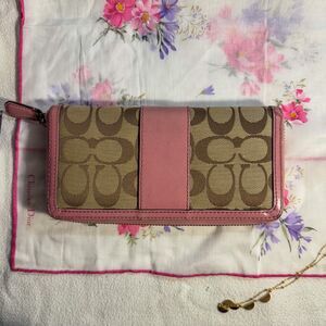 coach, wallet, signature canvas, monogram, y2k, vintage, tan and pink, 2000s, pre-owned, designer wallet, classic, retro, fashion accessory, light academia, soft girl, worn-in, distressed.