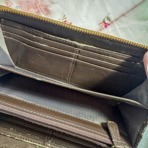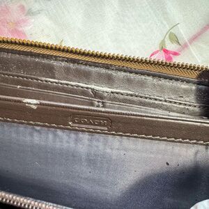 Condition: The wallet is in pre-owned, "well-loved" condition. The exterior canvas has some wear, particularly around the edges and on the zipper pull. The interior is where the most significant wear is visible; there is peeling on the lining and on the inside leather, and the material shows signs of dirt and use. This item is perfectly functional but is sold "as is." The wear is a reflection of its age and history.
