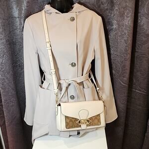 Elegant and versatile Coach shoulder bag in classic signature jacquard canvas with smooth white leather trim and gold hardware. Designed for everyday wear with a chic, polished look.