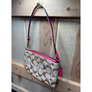 This wristlet combines the iconic Coach signature canvas pattern with vibrant pink leather accents, offering a stylish and practical accessory for carrying essentials.
