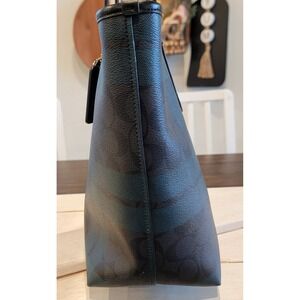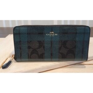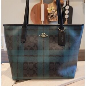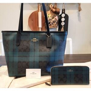 Coach Signature Canvas Zip Top Tote & Wallet Field Plaid Black Teal Green F80028