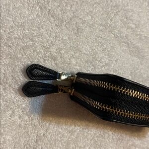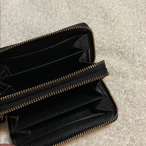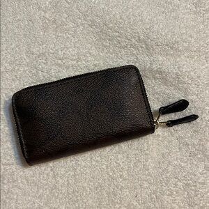 Elegant Coach wallet in dark brown leather. Features a zip-around closure.