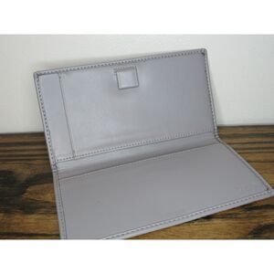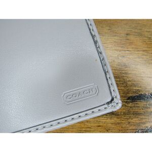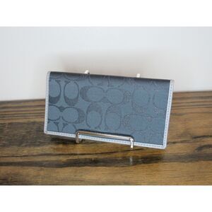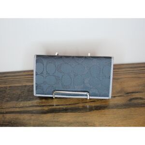 A sophisticated Coach checkbook cover featuring the classic Signature 'C' pattern in a refined black-grey shade. The "C" is in a glittery fine stitching. The light trim provides a clean contrast. Perfect for keeping your checks and registers organized in true Coach style!