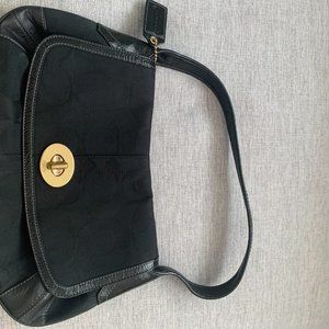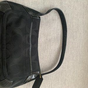 A Coach ergo flap hobo bag. This handbag has a black exterior with the Coach logo pattern and a gold tone clasp. There is one exterior pocket in the back. The serial number is K0794-11602.