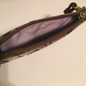 Brown Coach Signature wristlet with a lavender colored interior. Used, but in good condition with a little bit of small scratches on the corner leather.
