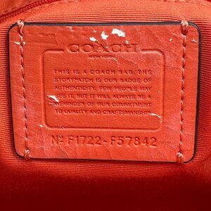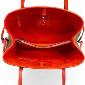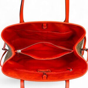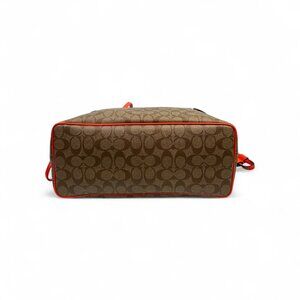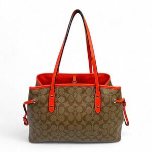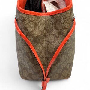 Stunning Coach Signature Coated Canvas Drawstring Carryall Bag! Beautiful coated canvas bag from coach that is amazing shape other than some wear on the creed, 8/10. The outside of the bag is spotless and the lining is in great condition. The bright orange liner pairs so well with the brown coated canvas brought all together with a bright orange hangtag!