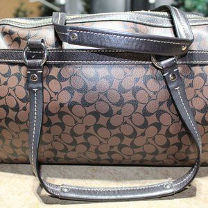 Coach Signature Coated Canvas with smooth leather "speedy" satchel Bag. Inside zip and multi function pockets.Outside front and back pocket. apx dimensions W 12", H 9" D 6". Excellent Used Condition.