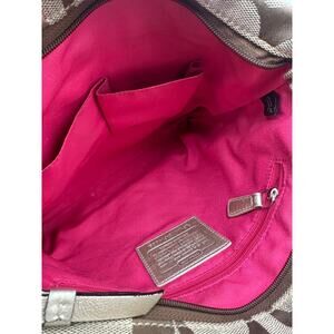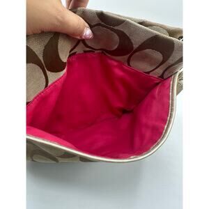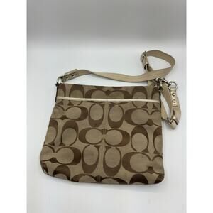 Coach Signature Crossbody Bag in brown tan (F14869) featuring signature canvas with leather trim, adjustable strap, and zip closure. Measures approximately 12”W x 11”H with a 23” drop. Used condition—please review photos for details. Perfect for hands-free style. Carefully packaged, ships in one business day.