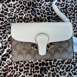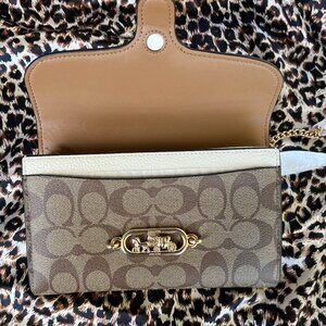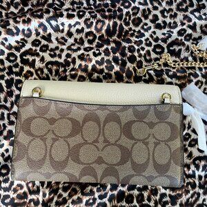 Coach signature canvas and leather chain crossbody finished with a magnetic snap closure & a detachable long strap for shoulder or crossbody wear.