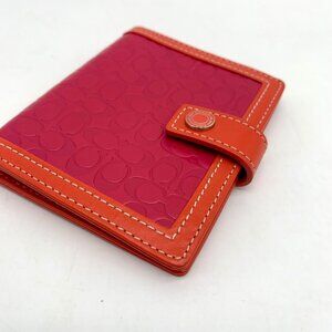 Accessorize with flair using the Coach Signature Embossed Leather Pink & Orange Bifold Wallet - a vibrant and stylish essential that adds a pop of color to your everyday carry. (4256-S4-4.24)